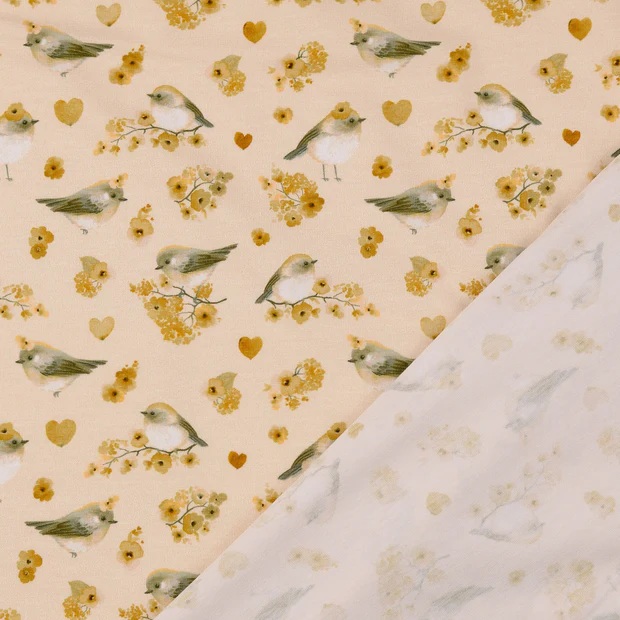 Jersey digital | Vögelchen Blumen | Beige Senf Grau